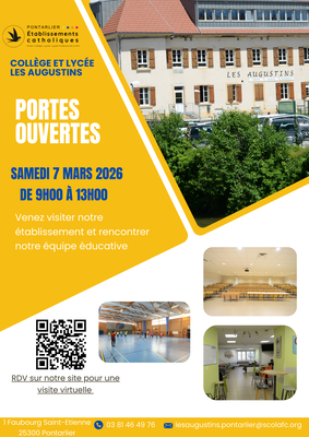 Portes Ouvertes Collège et Lycée Les Augustins Quand le 07/03/2026 de 09h00 à 13h00 Où PONTARLIER Ajouter l'événement au calendrier vCal iCal Bienvenue aux portes ouvertes Collège et Lycée Général - Les Augustins Le samedi 7 mars 2026 de 9h00 à 13h00